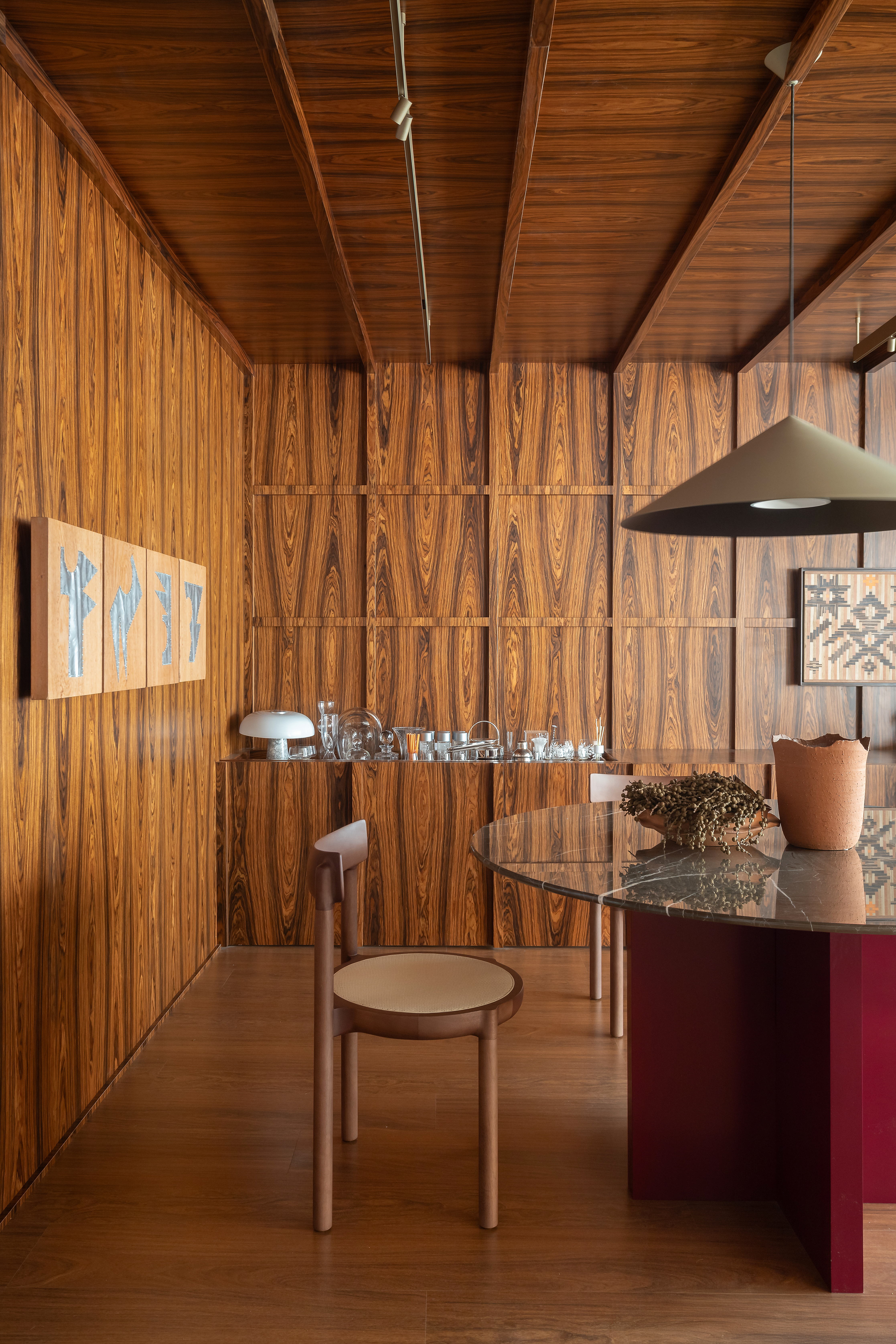 “Trabalhar com o piso da Quick-Step nessa cor mais avermelhada fez um contraste perfeito com a marcenaria. Foi essa relação harmônica que uniu os ambientes”, explica o arquiteto.