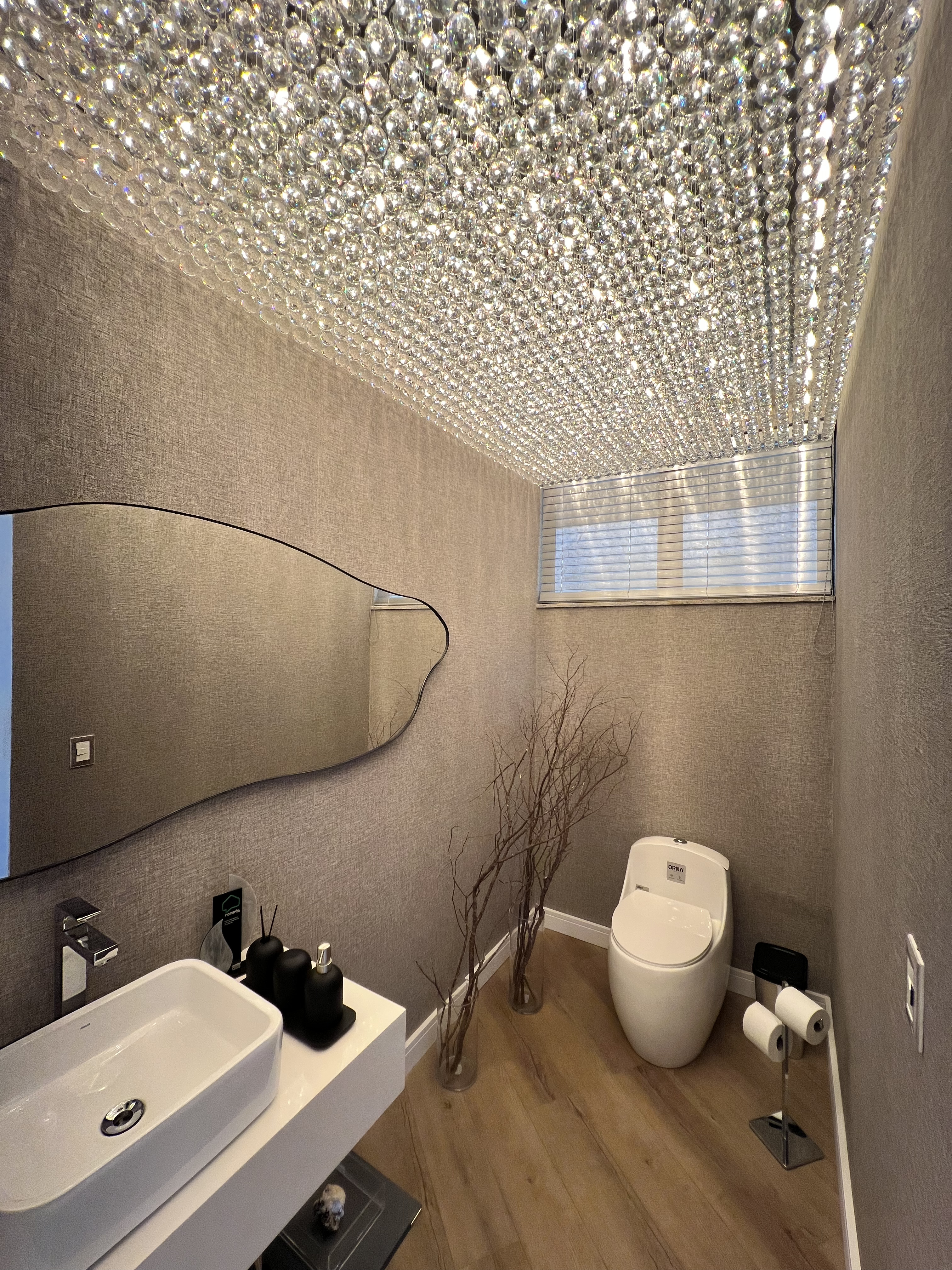 O Lavabo Chuva de Luz propõe uma experiência sensorial mais cênica. O teto é coberto por luminárias de cristal, criando o efeito visual que dá nome ao ambiente. As paredes exploram texturas e papéis de parede, combinados com um piso vinílico clicado Quick-Step, com estética amadeirada.
